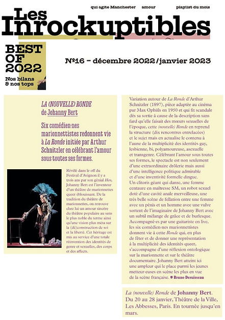 Une réécriture complète, confiée à Yann Verburgh, à partir de la structure initiale: des histoires entrelacées où chaque personne vit une rencontre intime avec la suivante. Les personnages sont incarnés par des marionnettes manipulées à vue par une équipe de jeunes acteur·ices. La diversité des corps se veut le reflet de la pluralité des êtres et des vies, rassemblés dans cette mosaïque de récits percutants et touchants. La mise en scène chorale, très cinématographique, permet de passer d’une rencontre à l’autre, révélant ce qui nous rassemble dans nos différences : l’amour, tout simplement.